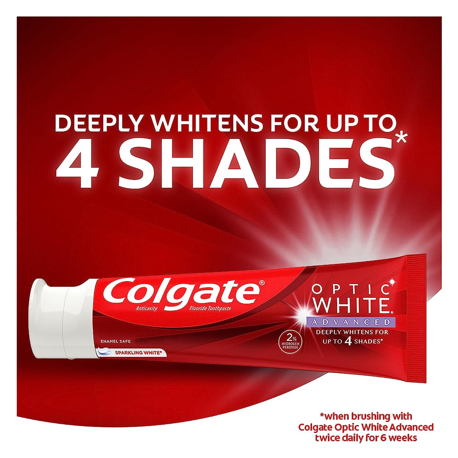 - Optic White Advanced deeply whitens up to four shades* and helps whiten teeth both inside and out (*when brushing twice daily for 6 weeks)